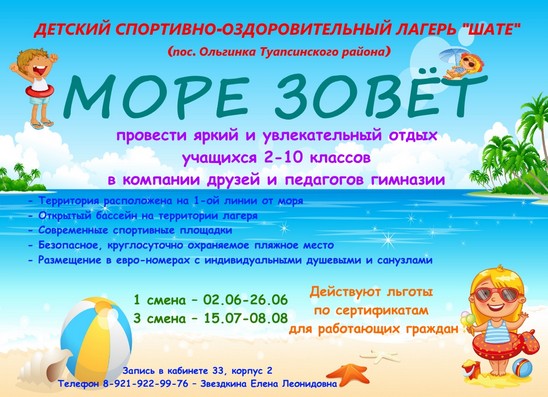 По вопросам о наличии мест в летних лагерях других школ района обращаться по телефону 382-35-38 к специалисту отдела образования Кропотиной Юлии Юрьевне.