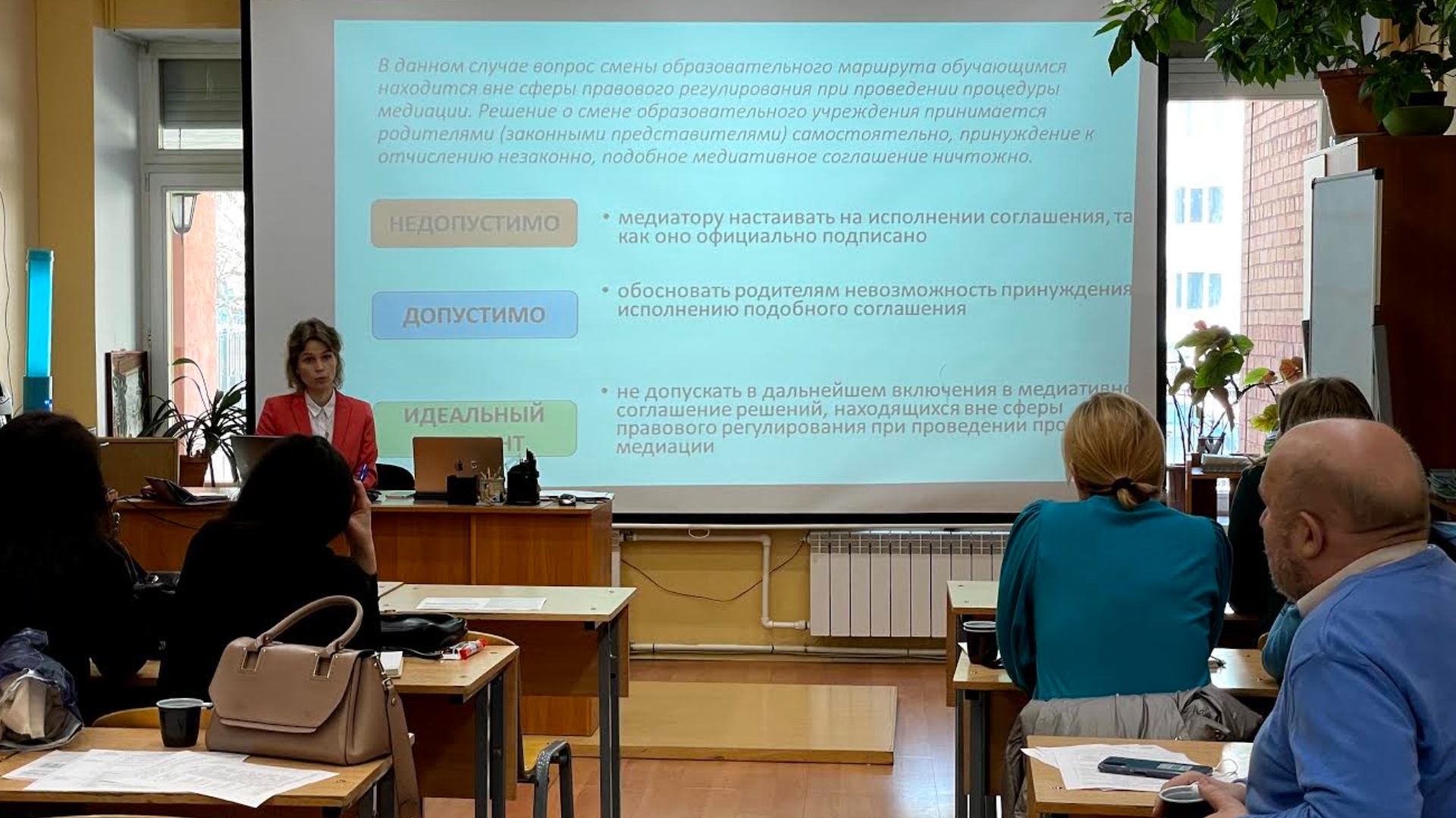 В рамках мероприятия были рассмотрены нормативные и организационные основы работы СШМ, представлен опыт Василеостровского района Санкт-Петербурга по развитию направления школьной медиации, обсуждались способы применения медиативных технологий в контексте работы с родителями, а также были продемонстрированы практические аспекты реализации деятельности СШМ ГБОУ гимназии №586. Благодаря использованию метода кейсов, слушатели смогли получить опыт в оценке правовой позиции медиатора. По итогам семинара было проведено тематическое тестирование.