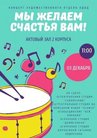 В 11:00 приглашаем родителей, чьи дети обучаются в ОДОД и родителей будущих первоклассников в актовый зал 2 корпуса на концерт художественного отдела «Мы желаем счастья вам!».