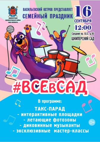#ВСЕвСАД - это большой семейный праздник ко Дню Василеостровского района, который пройдет 16 сентября 2023 года с 12.00 в одном из самых уютных уголков Васильевского острова - Шкиперском саду.